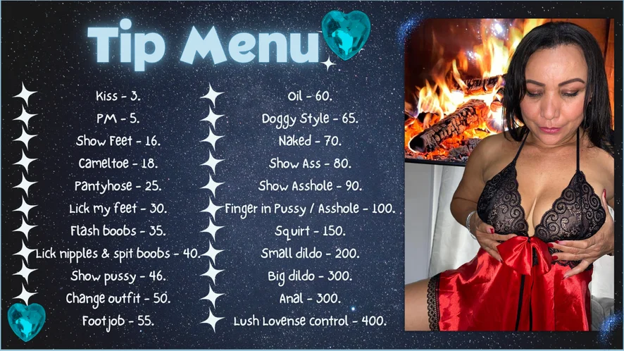 Кремпай, Догі-стайл, Душ, Глибоке горло, Приниження, Мастурбація, Олійне шоу, Мастурбація пальцями, Стриптиз, Еротичні танці, Лизання піхви, Мастурбація рукою